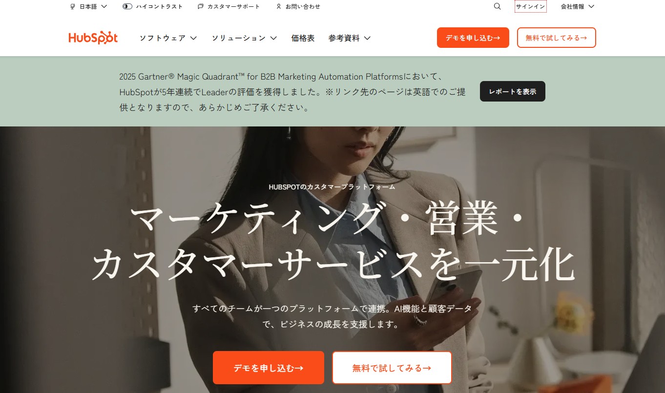 HubSpotは、マーケティング、セールス、カスタマーサービス、CRMを統合したプラットフォームです。メールマーケティング機能はその一部であり、顧客情報と連携させることで、一人ひとりに最適化されたパーソナルなメール配信を実現します。