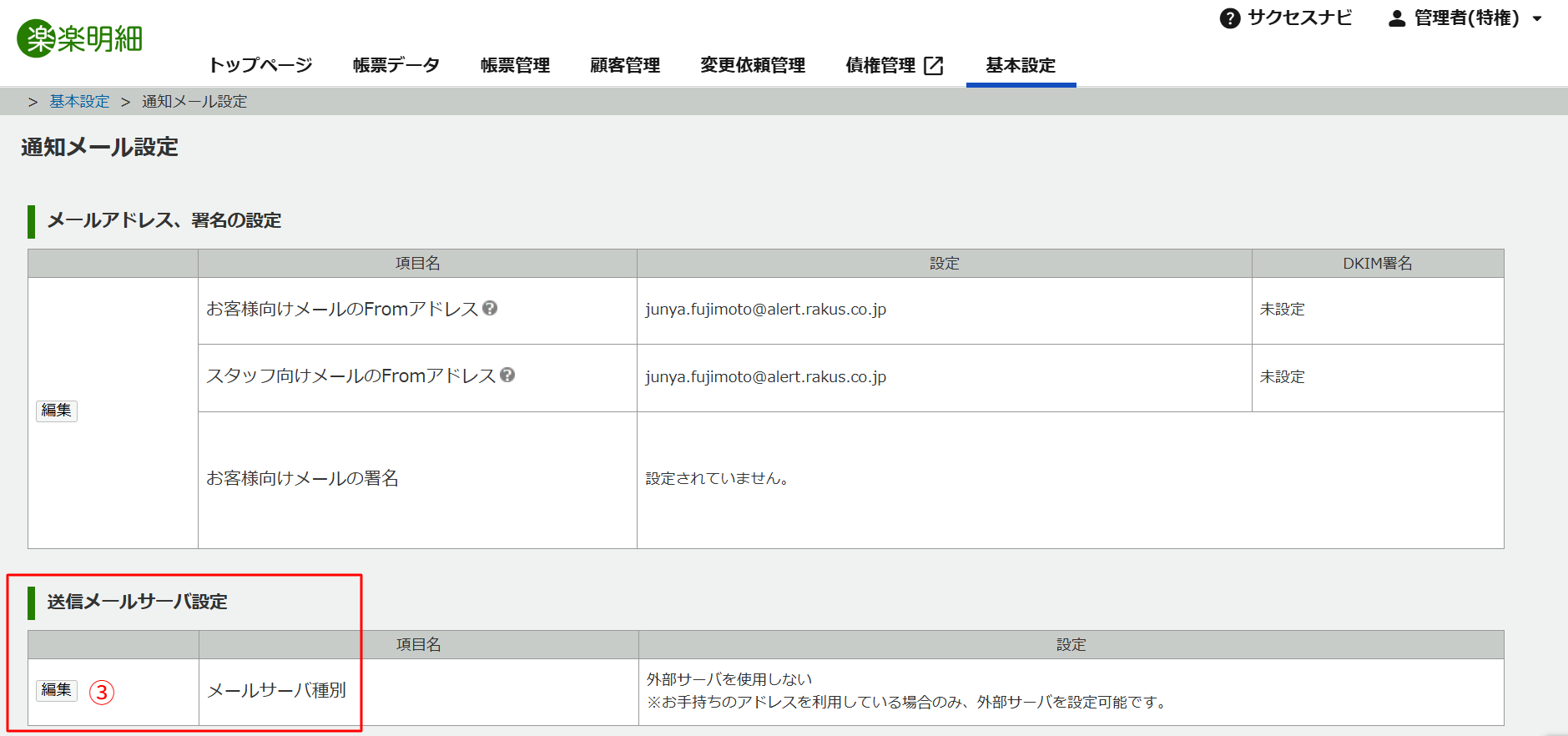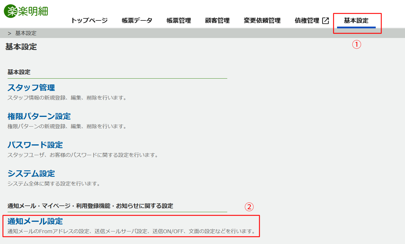 楽楽明細の管理画面にログインし、基本設定 > 通知メール設定 > 送信メールサーバー設定の順にアクセスします。