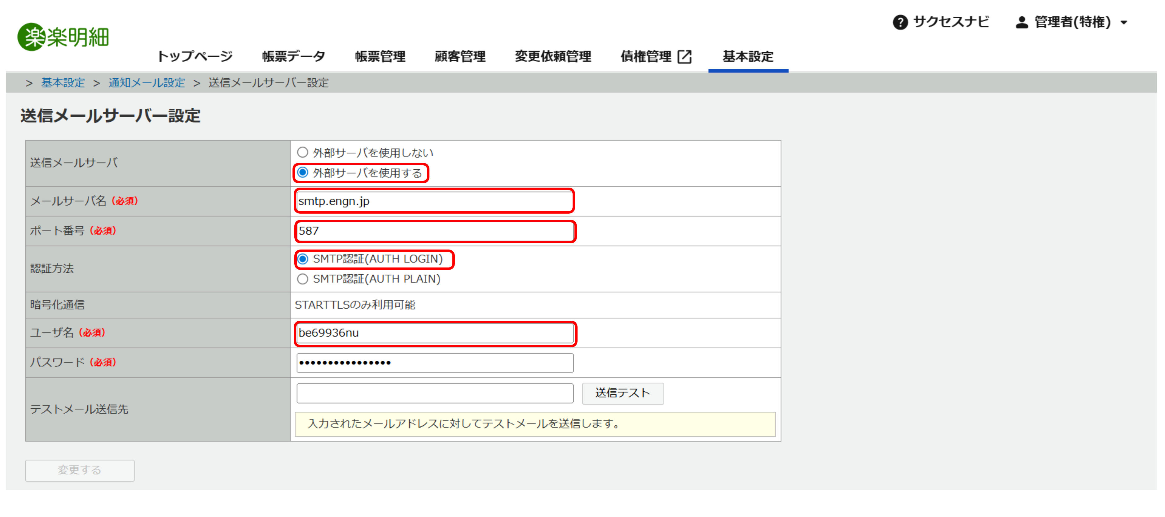 blastengineのアカウント準備が完了したら、楽楽明細の管理画面で外部送信メールサーバーの設定を行います。このセクションでは、楽楽明細の設定画面にblastengineの接続情報を入力する具体的な手順を解説します。