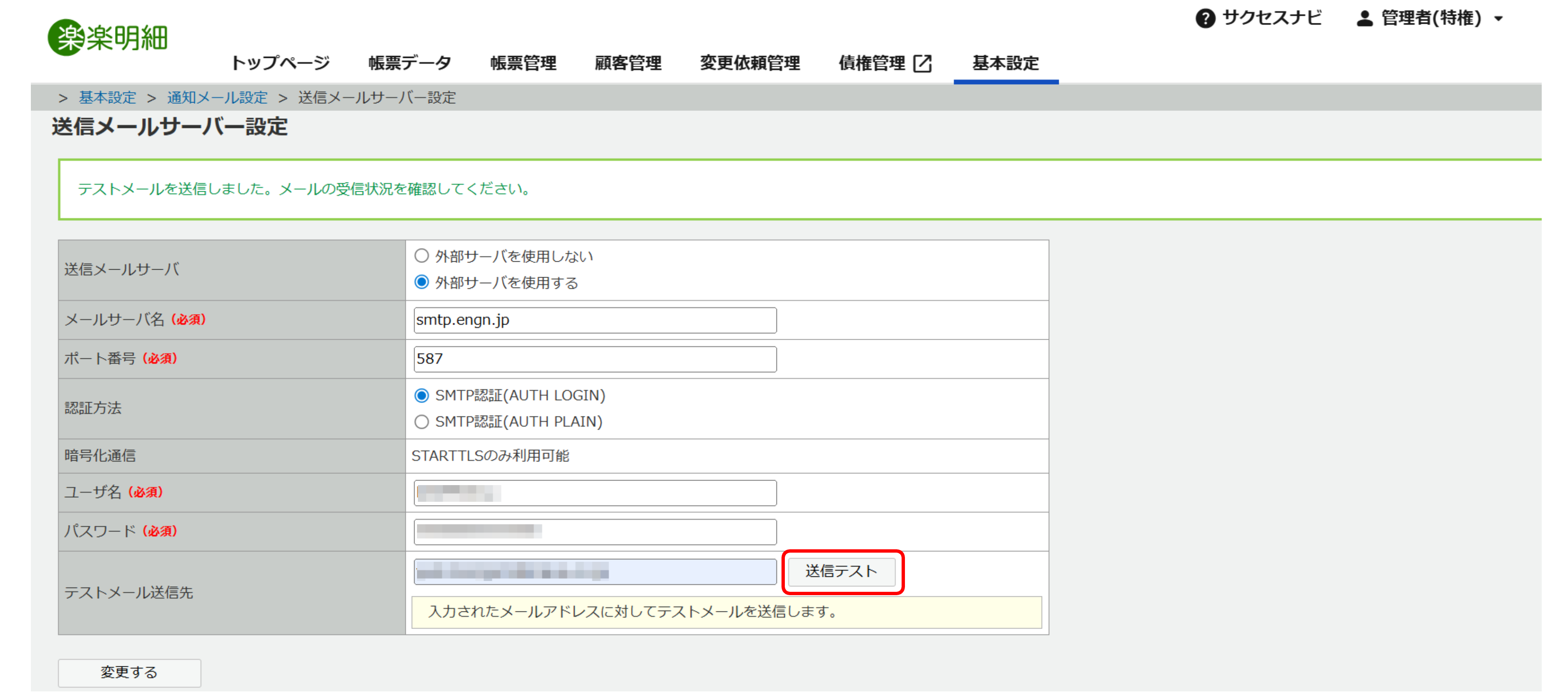 設定入力が完了したら、必ずテスト送信を実行して設定の正確性を確認しましょう。楽楽明細の送信メールサーバー設定画面には「テストメール送信先」の入力欄と「送信テスト」ボタンが用意されています。