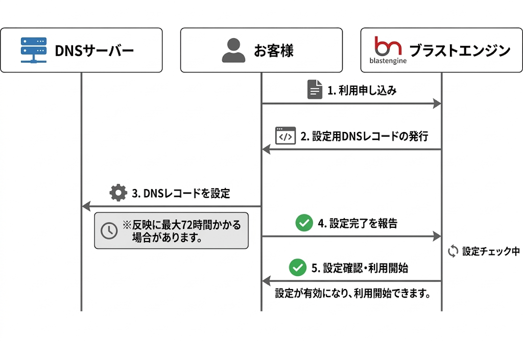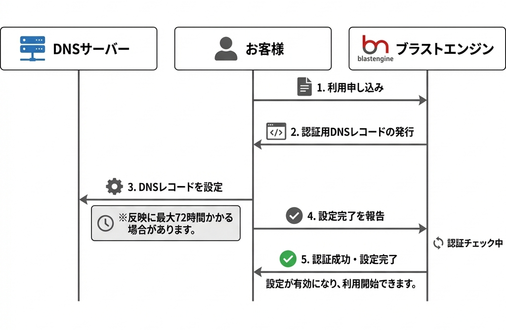 DNSレコードの設定完了後、最終的な認証確認を経て、持ち込みドメインでの配信がスタートします。認証と設定完了のステップは以下の通りです。