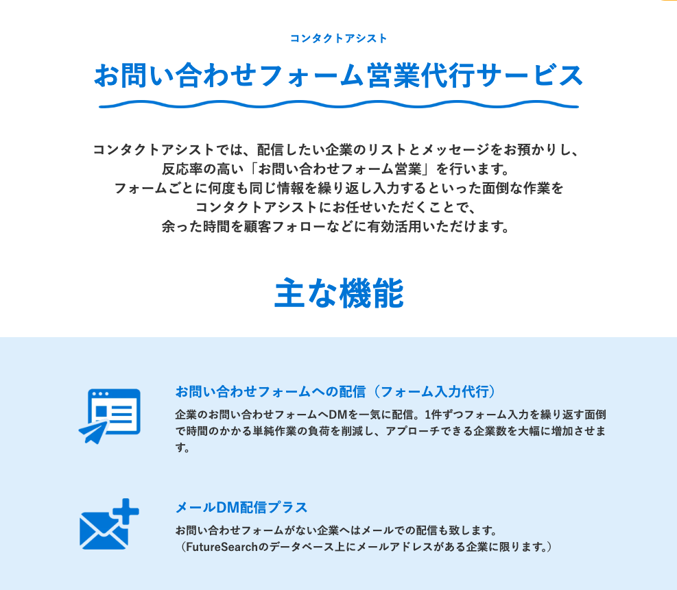 弊社は「効率的なアプローチで、アポ獲得を最大化すること」をミッションに、営業支援ツール「FutureSearch(フューチャーサーチ)」を提供しております。 本サービスは、独自の企業データベースを活用し、新規開拓における「ターゲット選定」から「アプローチ(問い合わせフォーム営業)」までをワンストップで効率化するツールです。